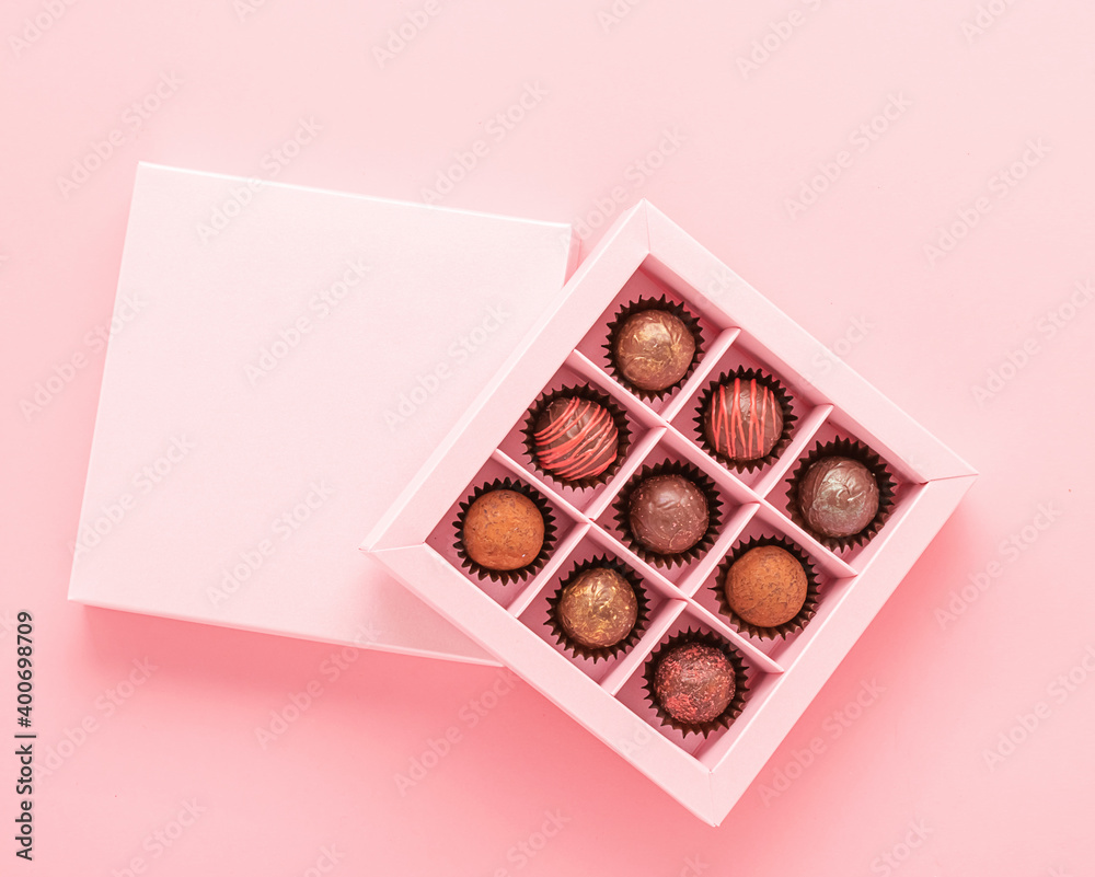 Chocolate truffle candies box pink background. Gifts festive food love concept