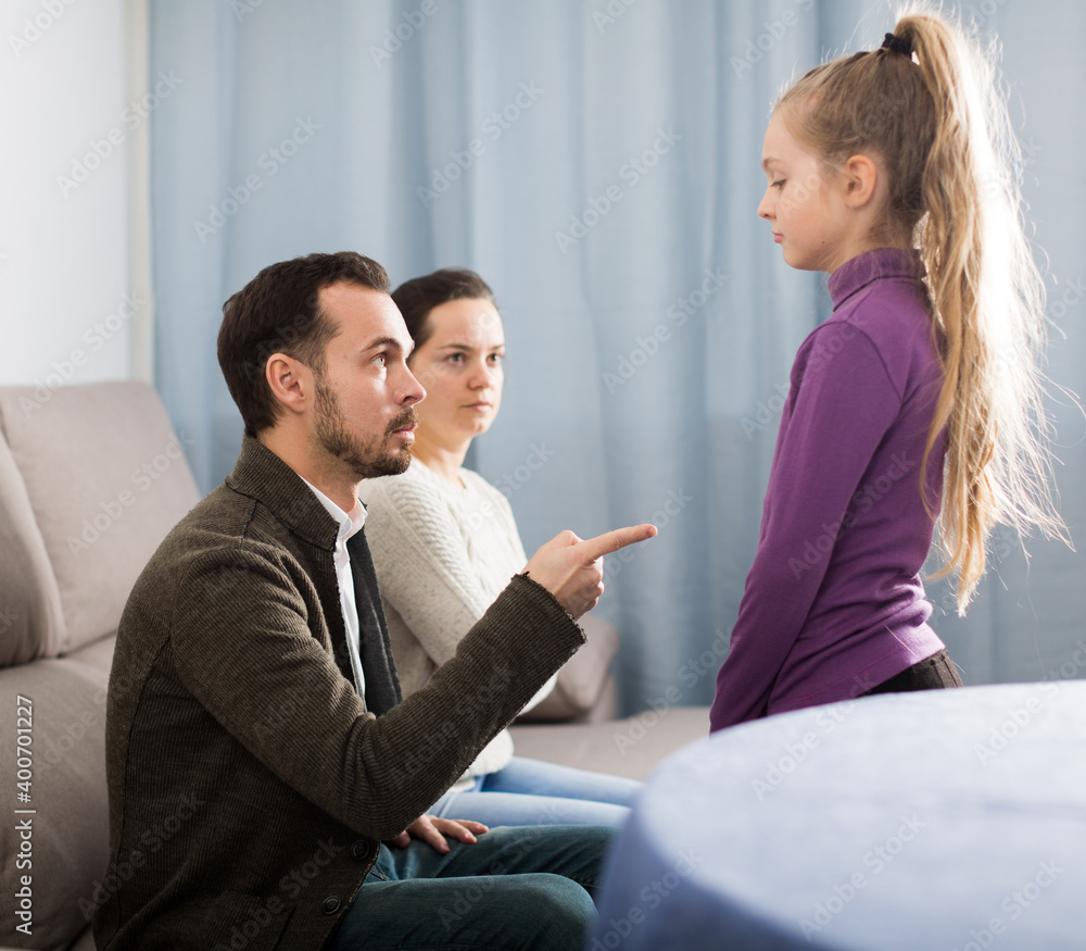 Young father and mother correcting their child for disobedience