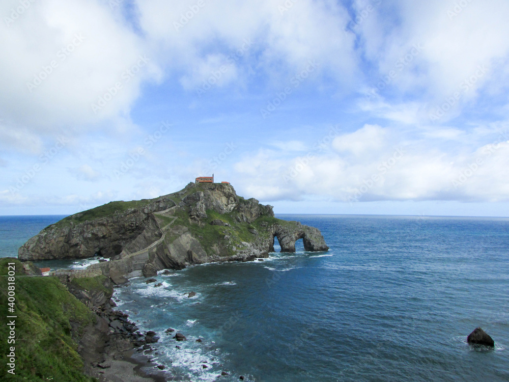 Old bridge and stairway to rock and church of San Juan de Gaztelugatxe, Basque Country, Spain