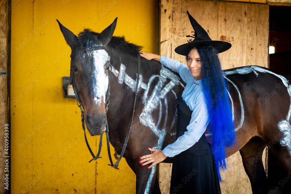 A girl dressed as a witch stands by a horse on which a skeleton is painted in white paint
