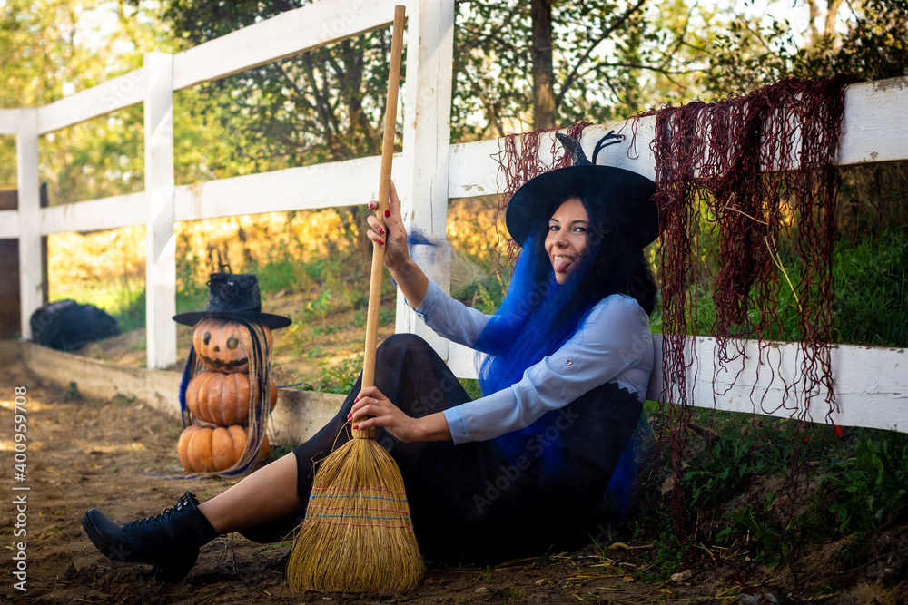 A girl dressed as a witch sits by a fence with a broom in her hands and shows her tongue