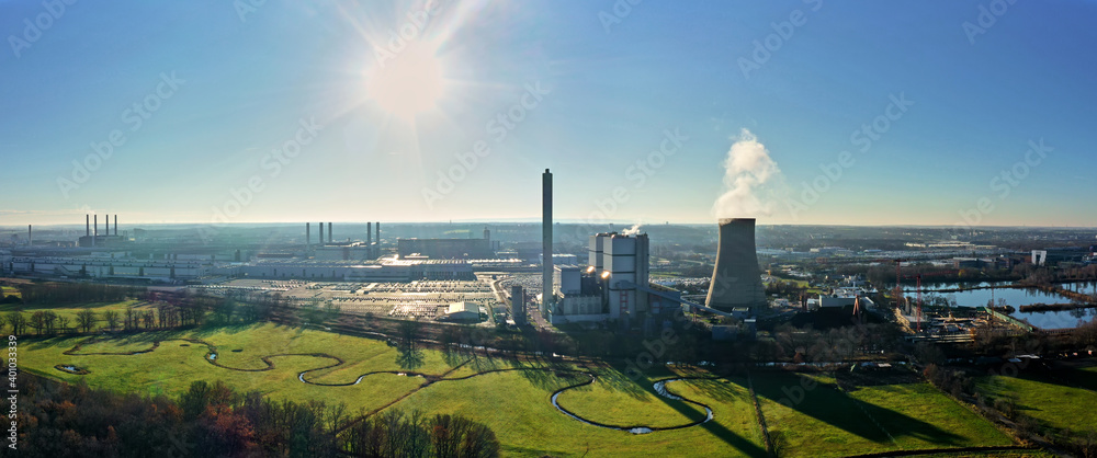 Aerial view of cogeneration plant west quake of a car factory in Wolfsburg with view against the bright midday sun