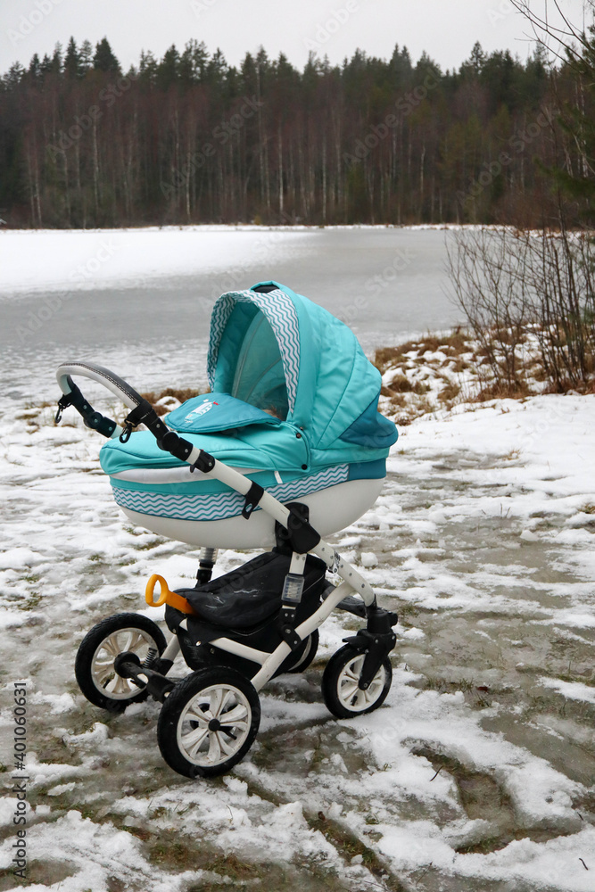 colorful baby carriage in the park with frozen lake on the background