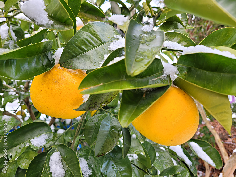 귤나무 위에 내린 흰눈, 하귤나무 위에 내린 흰눈, 하귤, Tangerine from Jeju Island, Korea, Watson pomelo, Snowy landscape, Snow on Watson pomelo