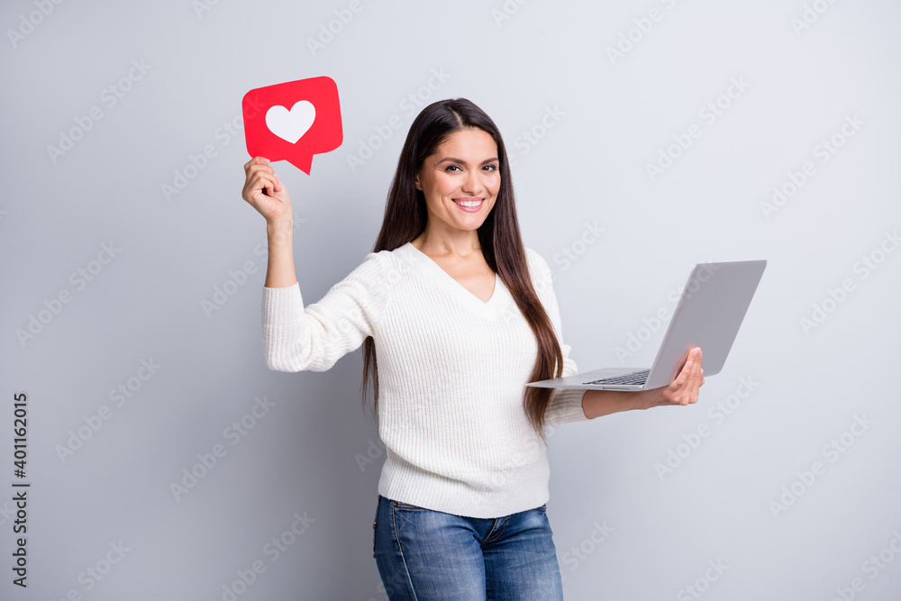 Portrait of attractive cheerful girl holding in hands using laptop paper like card isolated over grey pastel color background