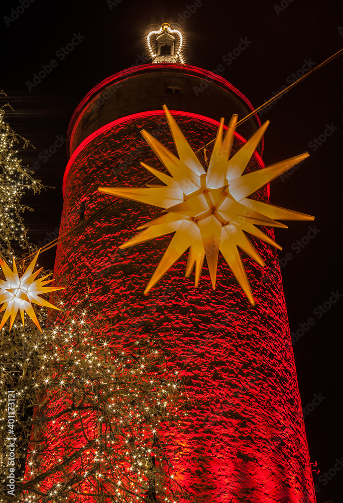 Rot illuminierter Marktturm in Kitzingen Mainfranken. Größte Weihnachtskerze Bayerns