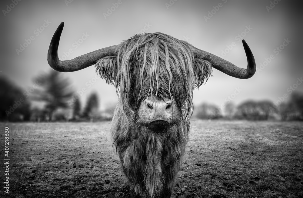 Schottisches Hochlandrind als Schwarz Weiss Bild