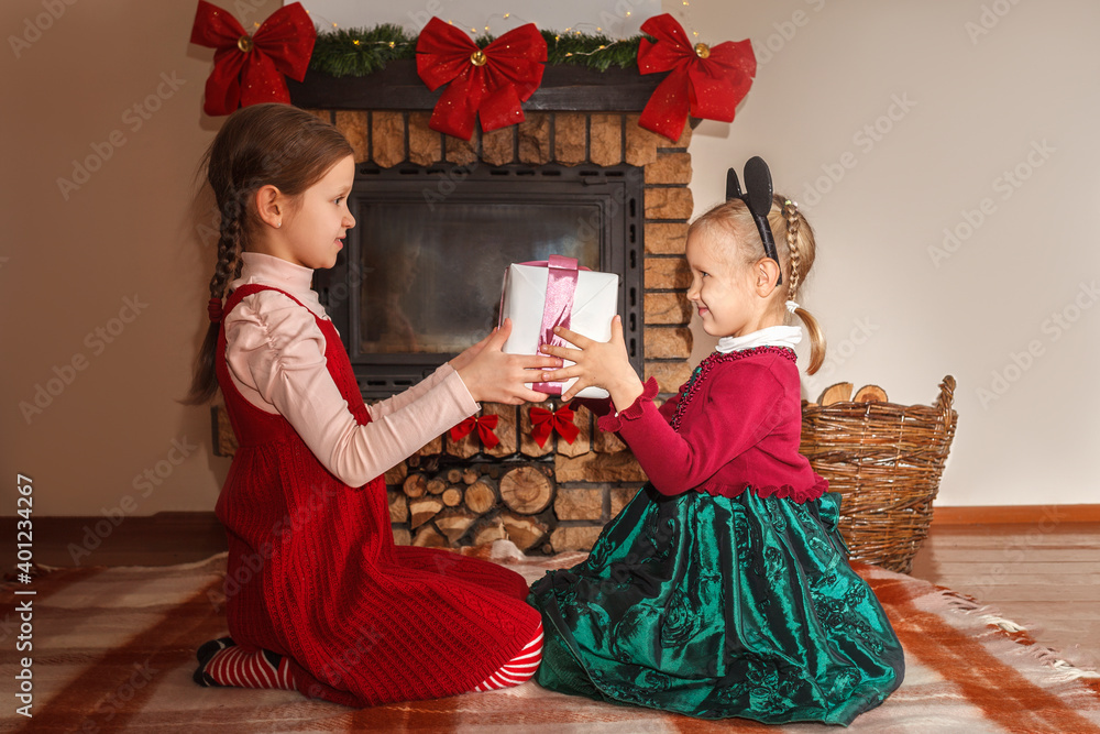 Two children with a gift near the decorated fireplace. The girl gives a gift to her sister