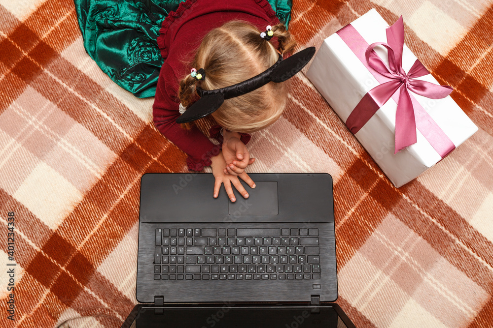 Little girl on the floor near the laptop. The child lies near the box with a gift