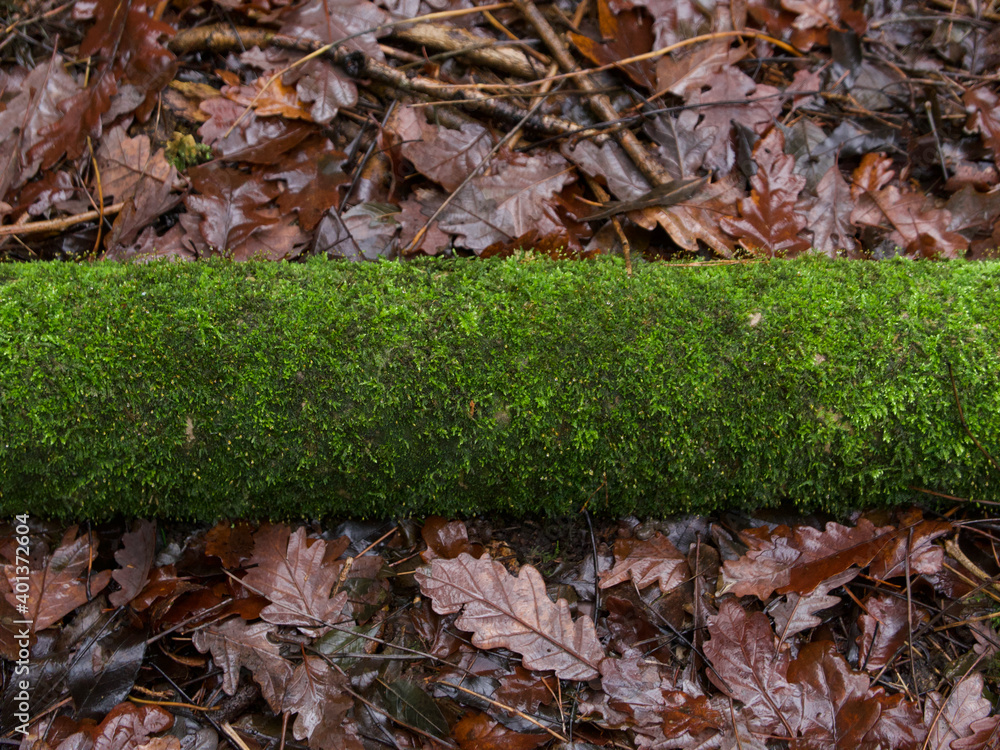 Moss covered pole with copy space lying on brown autumn foliage