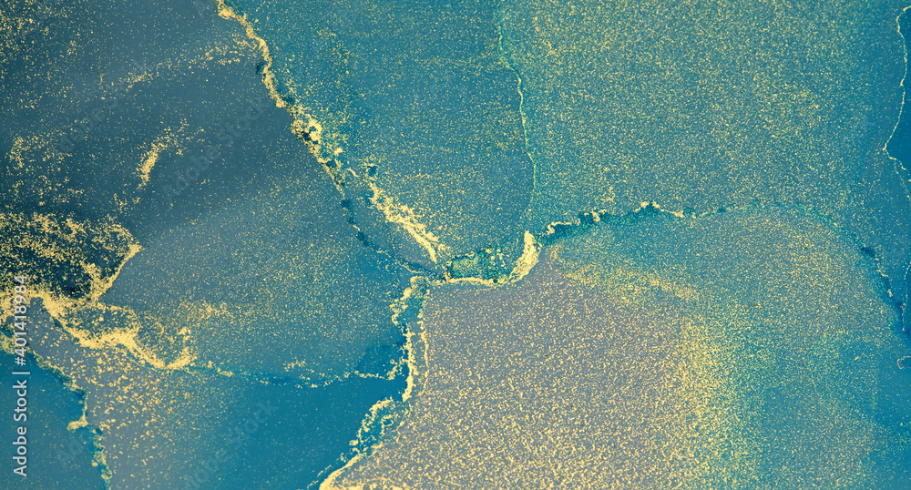 Art Abstract painting blots horizontal background. Alcohol ink blue and gold colors. Marble texture.
