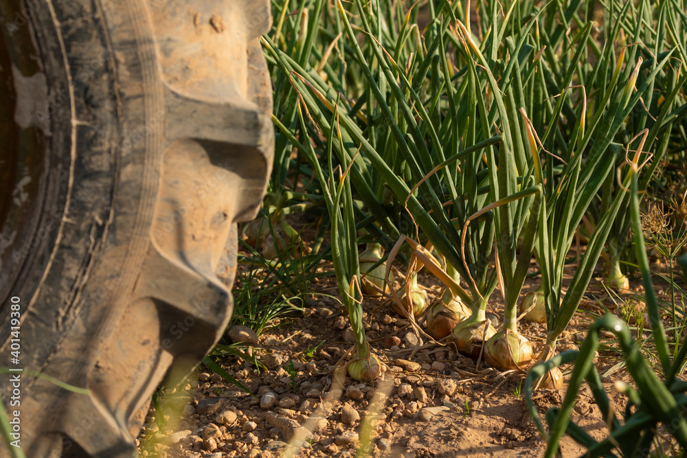 Growing onions in a farm field, a seasonal food crop, in the agricultural areas surrounding Gallur, a town in Aragon, Spain. Primary sector, agriculture.