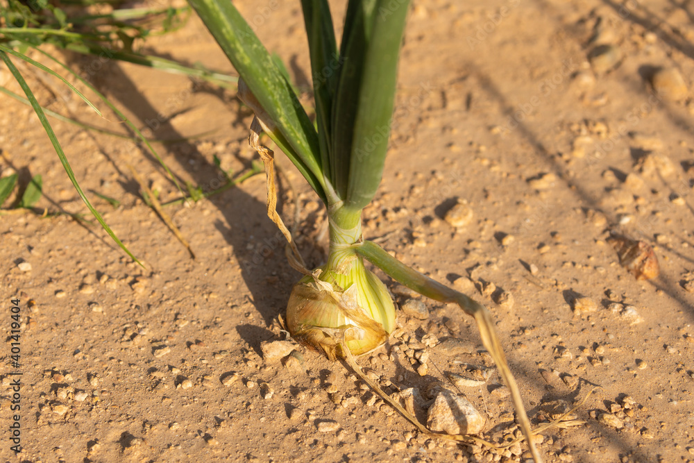 Growing onions in a farm field, a seasonal food crop, in the agricultural areas surrounding Gallur, a town in Aragon, Spain. Primary sector, agriculture.