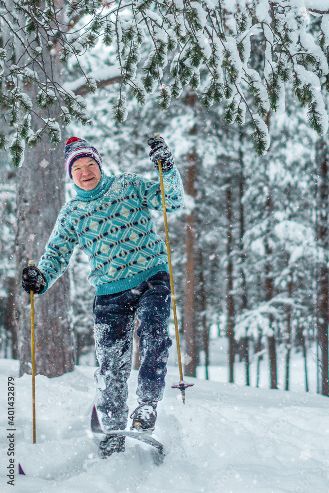 beautiful happy healthy elderly man in a blue knitted sweater and cap in a winter park spruce forest skiing.