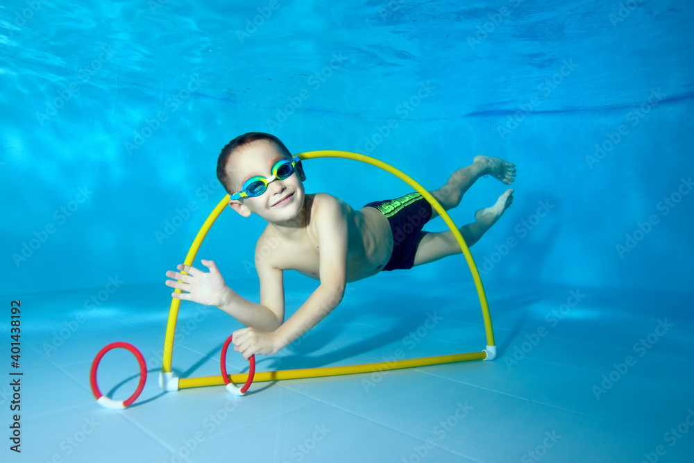 A beautiful little boy dives underwater in a children's pool. He swims through the Hoop, pulls out toys. Active happy child. Healthy lifestyle. Swimming lessons under the water. A family sport