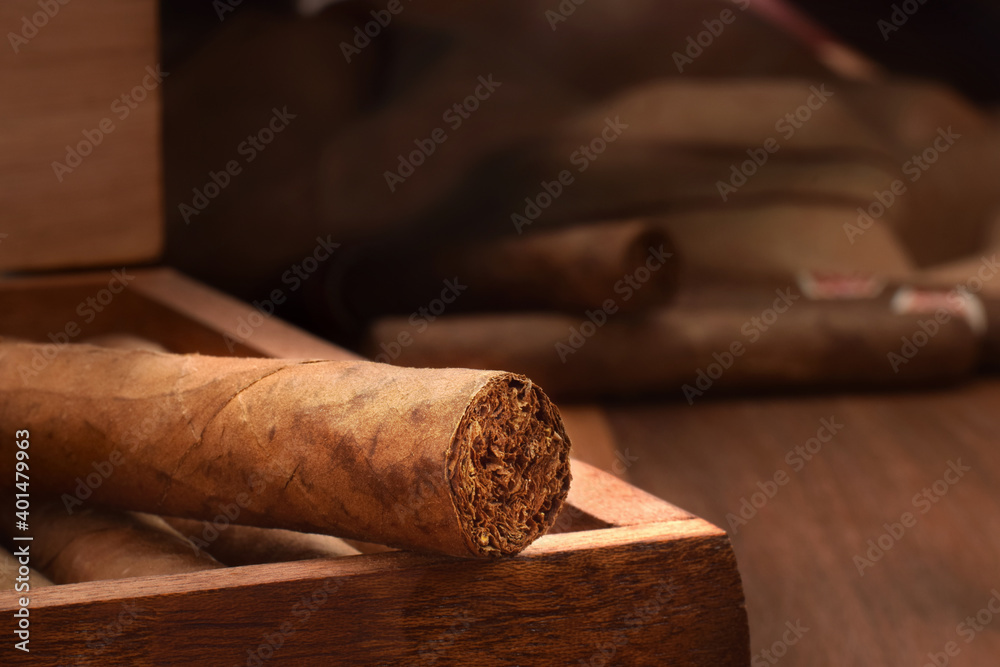 Handmade cuban cigar in wooden box humidor beautiful low key background with selective focus
