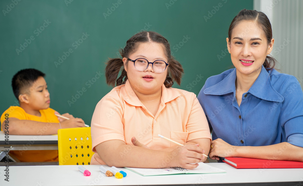 Asian disability child and Autism kid in special classroom with teacher