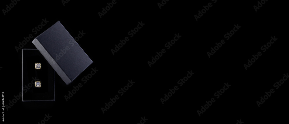 Gold earrings in dark grey box on black background. Valentine's Day Present