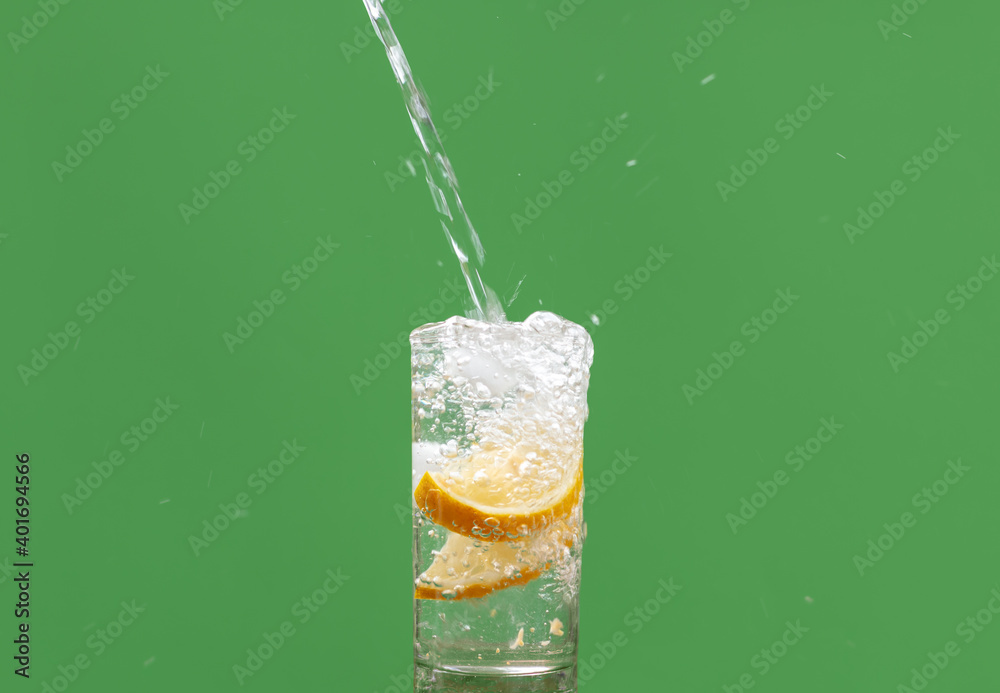refreshing glass of watter with lemon, lemmonade been served against green backgound