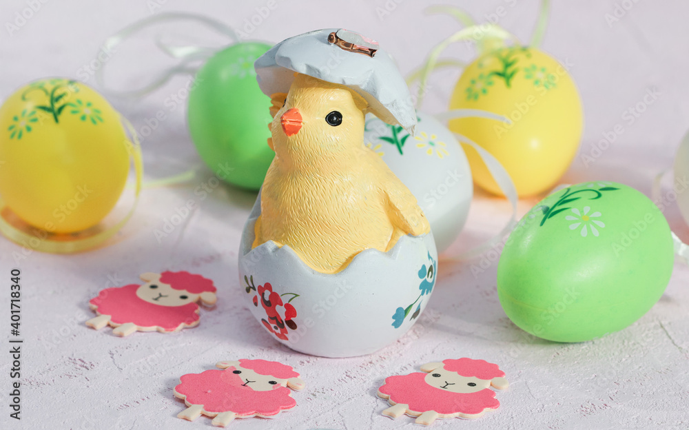 easter eggs and chicken. Easter chicken, eggs and lamb on a pink background, close-up side view.