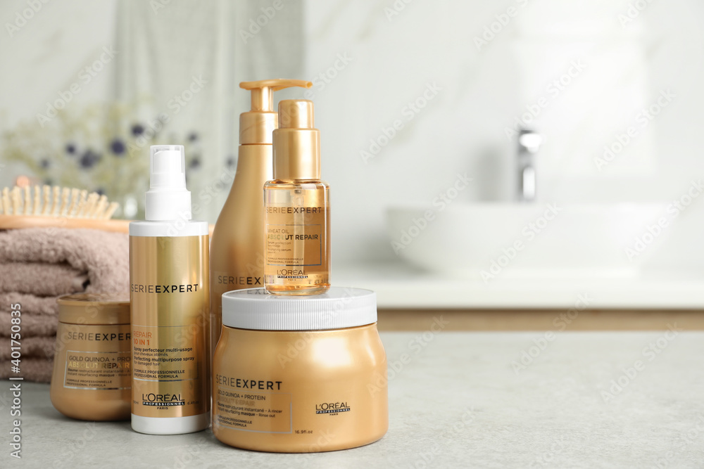 MYKOLAIV, UKRAINE - AUGUST 08, 2020: Set of L'Oreal hair care cosmetic products on light grey stone table in bathroom. Space for text