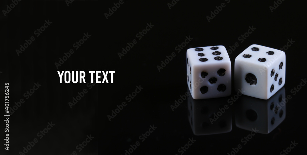 Two dice on a black background with reflection. Copy space