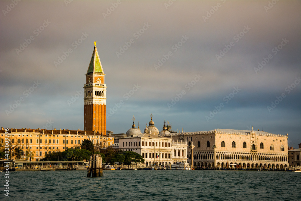 Venice landmark, view from the sea of Piazza San Marco or st Mark square, Campanile and Ducale or Doge Palace. Italy, Europe.