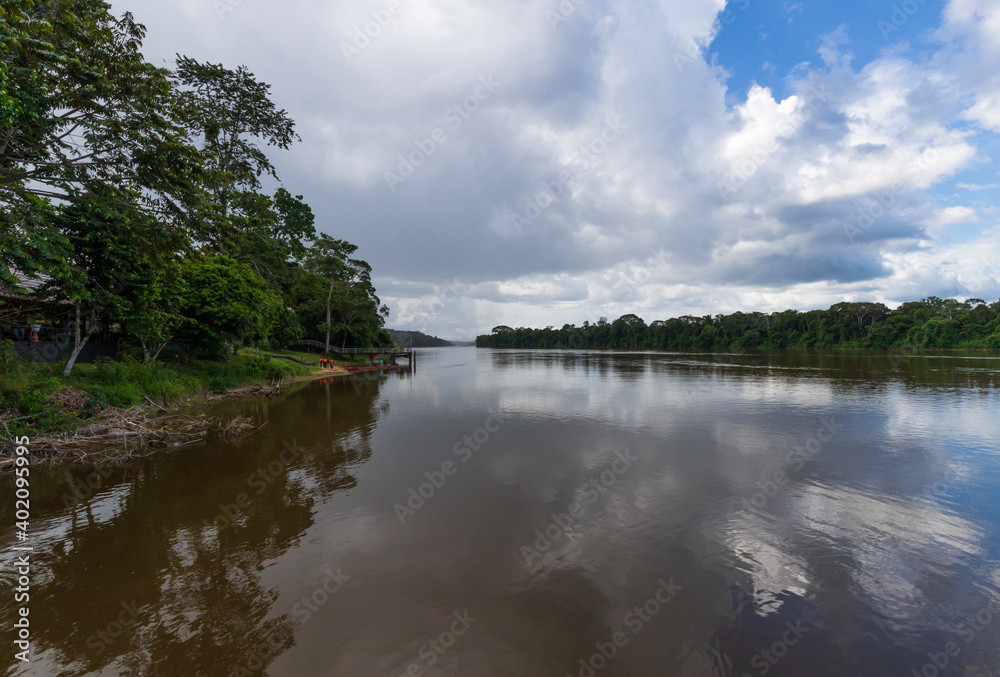 Long River Through Jungle Scenery In Brokopondo Suriname. Lush Green Trees Shadowed By Overcast White Clouds In South America.