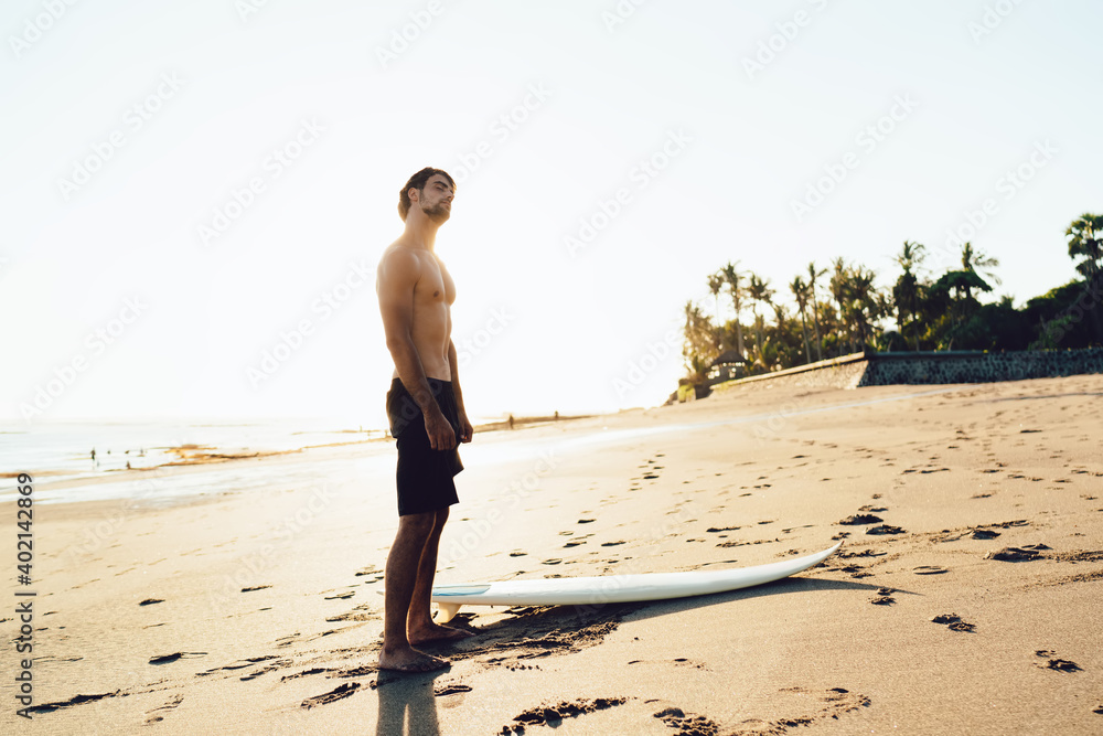 Shirtless male surfer stretching neck on beach