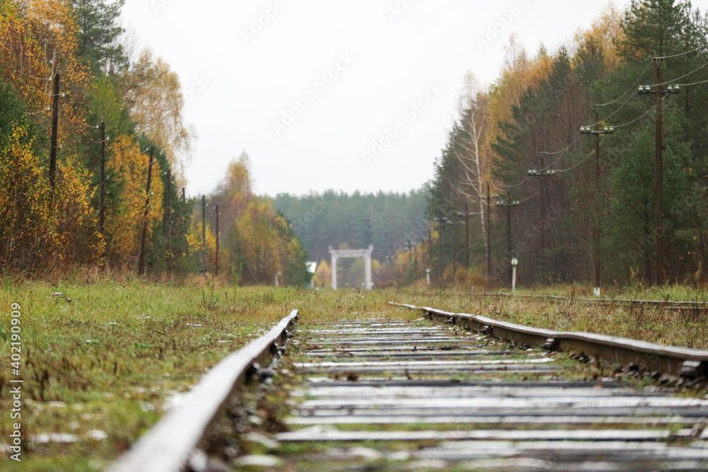 beautiful autumn view of abandoned railway in russian outback with bridge on the background
