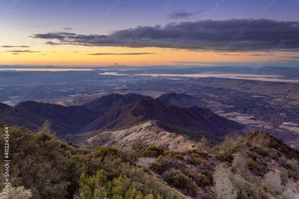 Sunset over Eagle Peak and Bald Ridge via the Main Peak, with the city of Clayton in the background. Mount Diablo State Park, Contra Costa County, California, USA.