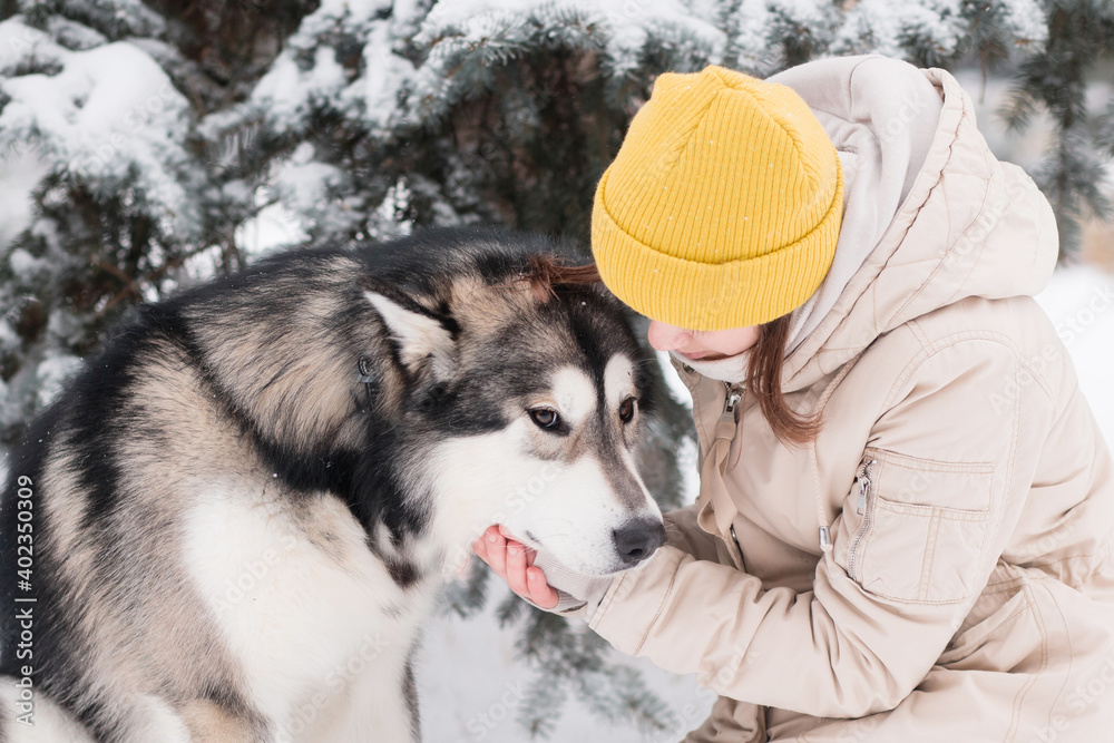 Woman pet with love Alaskan malamute in winter forest. close up.