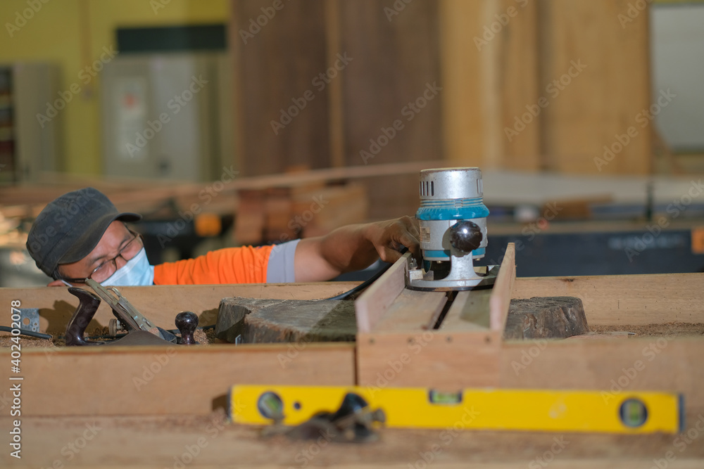 Front view photo of focused professional hardwood worker making slab table use electronic router.Woodworking and carpentry production .Furniture manufacture