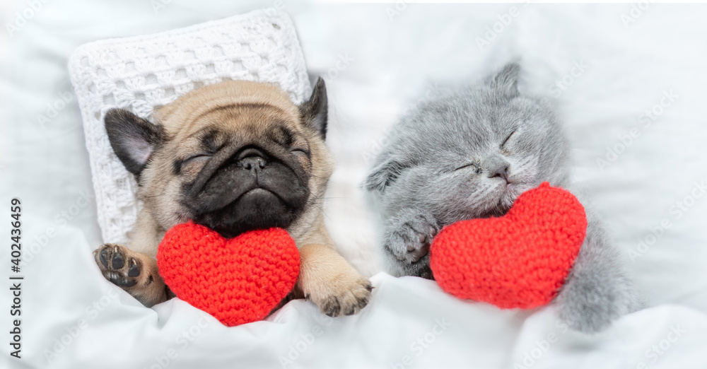 Kitten and Pug puppy sleep together with red heart under a white blanket on a bed at home. Top down view