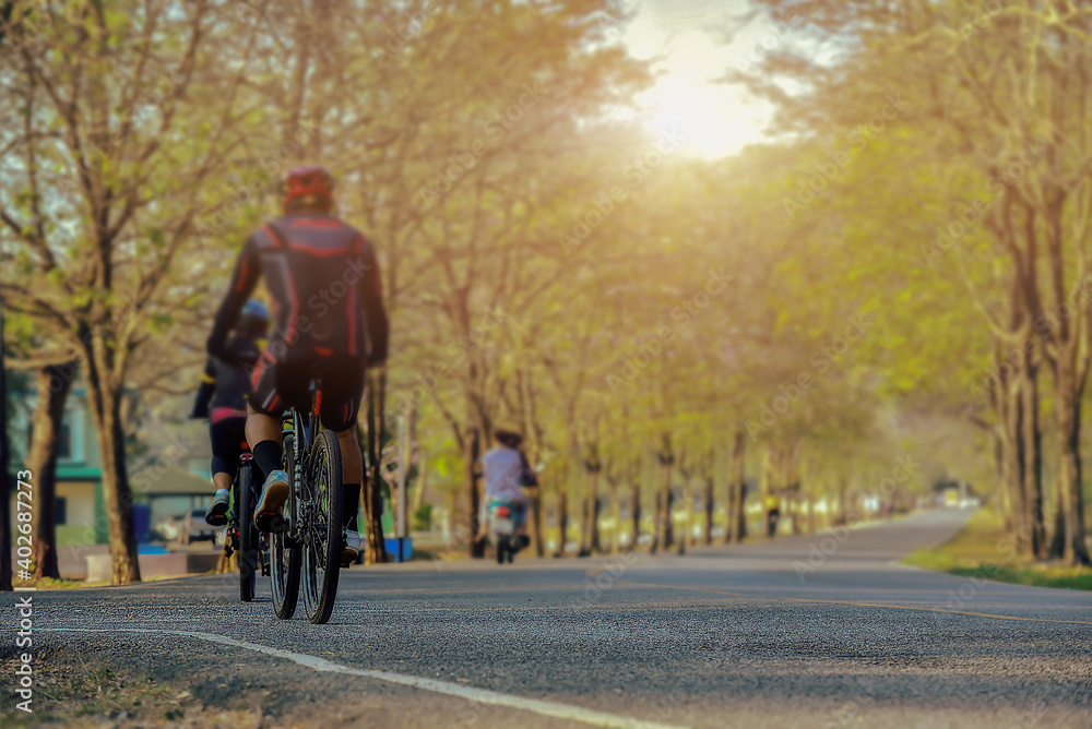 Cycling competition, cyclist athletes riding a race at high speed alective focus and blurred background.