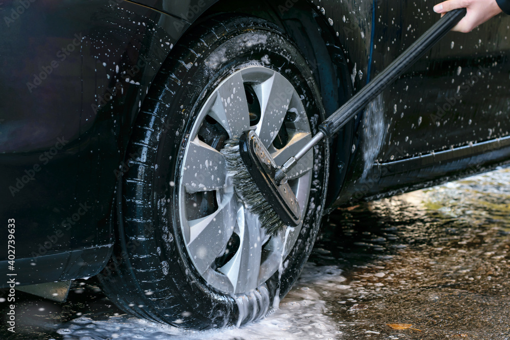 Car wash outdoor. Car wheel washing with a brush.