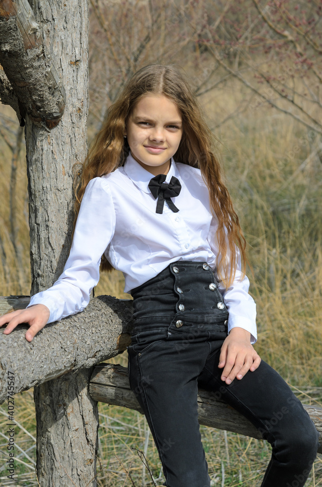 Portrait of a beautiful girl of ten years old, in the Gothic style, sitting on a wooden fence