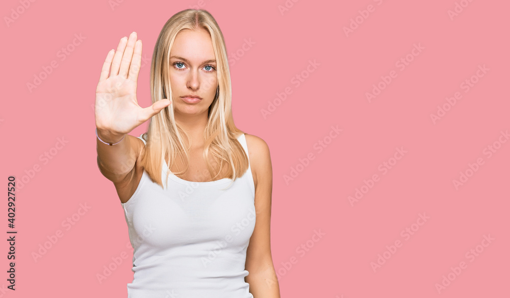 Young blonde girl wearing casual style with sleeveless shirt doing stop sing with palm of the hand. warning expression with negative and serious gesture on the face.
