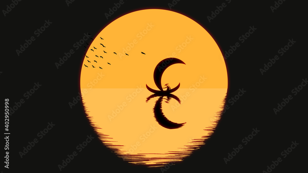 colorful sunset view with A person driving a boat and beautiful Seagull bird flying over sky, Sunset over ocean.Sunset Silhouette Travel and nature Concept, Seascape, 3D render.