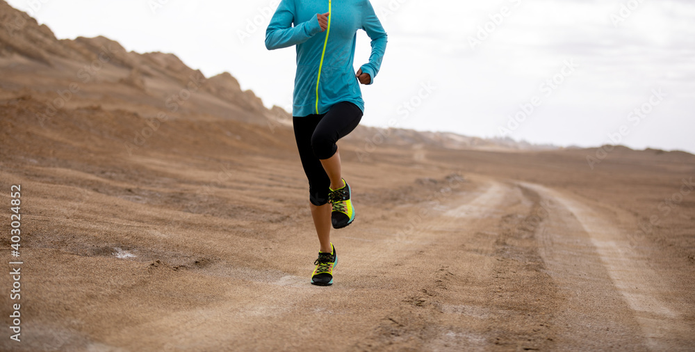 Fitness woman trail runner cross country running on sand desert