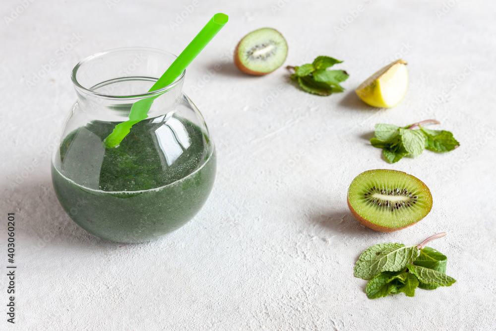 Close up of homemade green smoothie, fresh healthy organic food on white background.