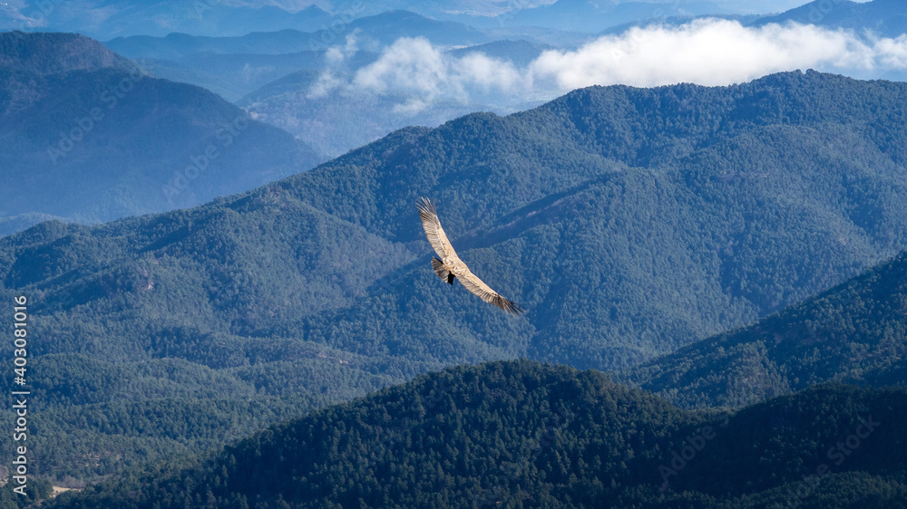 Vulture flying over alps mountains looking to hunt a prey. Majestic bird with wide wings.