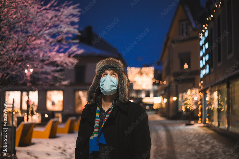 the attractive kind man in a fur hat and face mask with illuminated city lights at night during the celebration of Christmas and on New Year's Eve 2021 during the coronavirus covid-19 pandemic