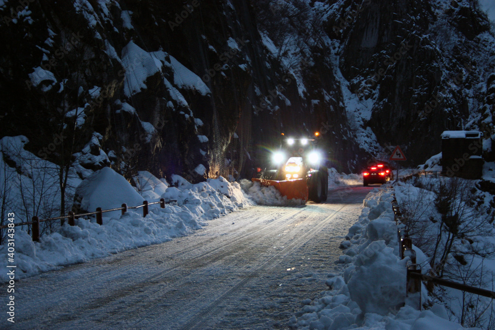 snowplow passes through the snowy mountain streets in the evening to clean up the road traffic