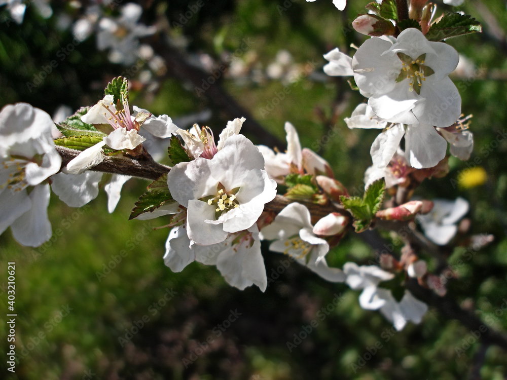 White flowers Felt cherry, Prunus tomentosa or Chinese cherry. Branch of blossoming tree with beautiful white flowers