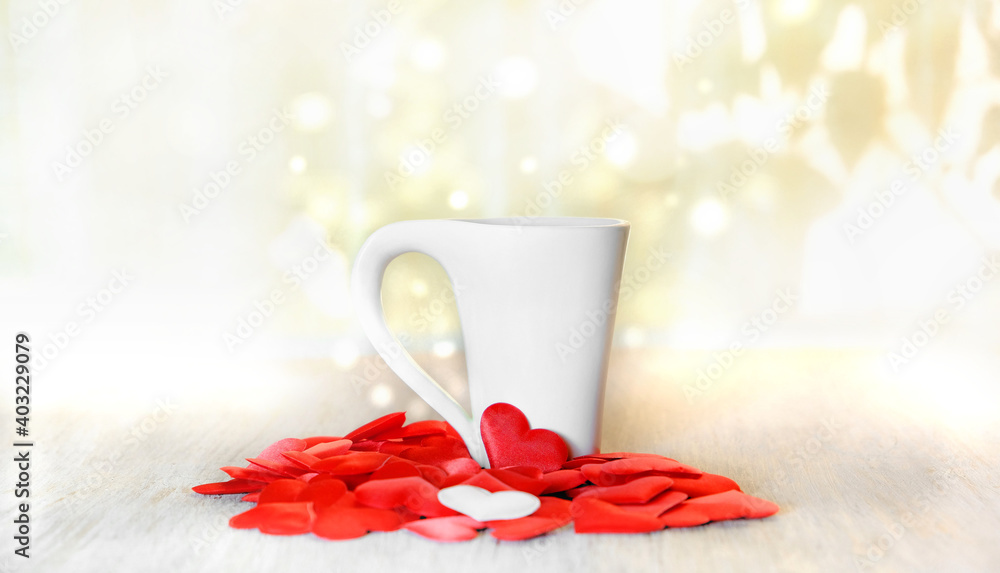 Cup of coffee or tea, hearts on wooden table, light, flare and bokeh , the concept of home comfort, romantic congratulation. Romantic morning surprise, love for coffee and St. Valentine's day
