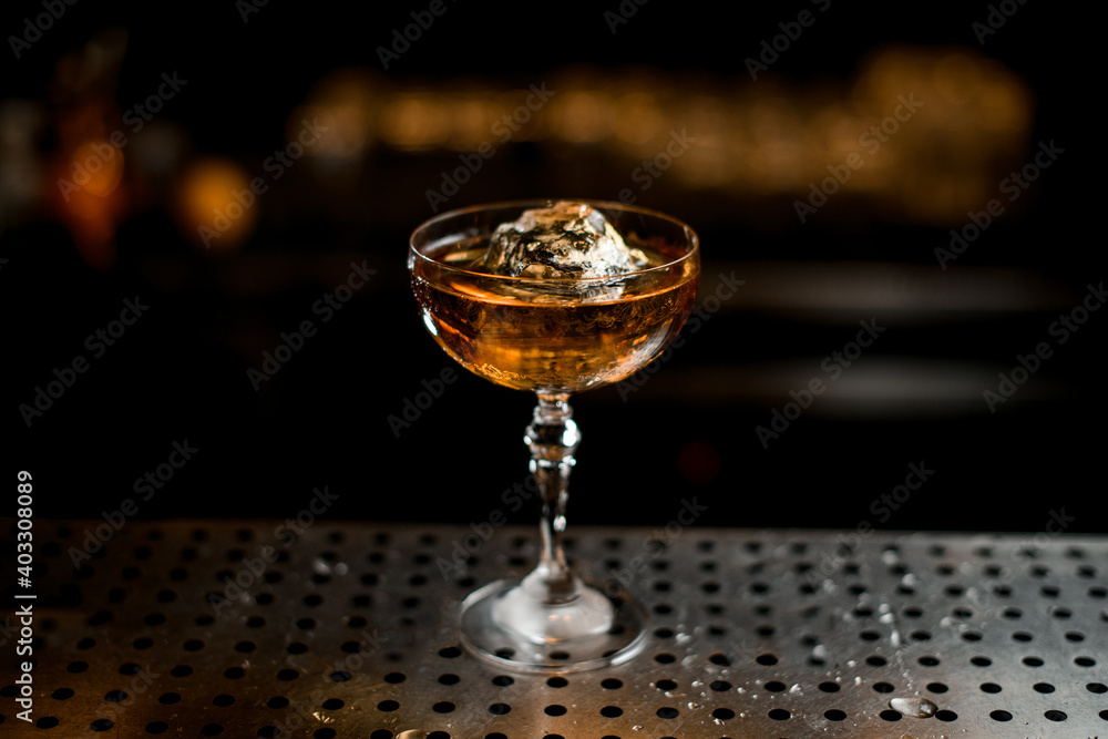 transparent wine glass of alcoholic drink with ice cube stands on the bar counter