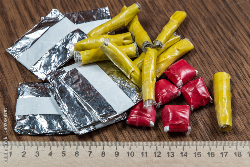 evidence of smuggling traffic: packages of unknown drugs next to the forensic scale