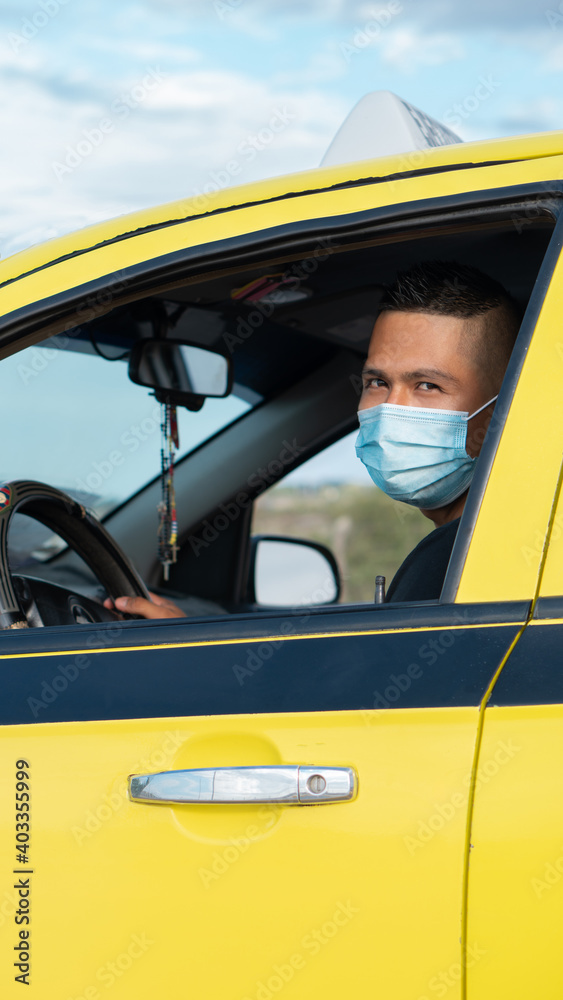 Latino taxi driver sitting inside his yellow car ready to work all day, wearing a mask for protection against the covid19 flu
