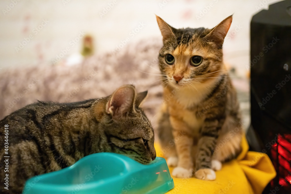 Cats eat from a double bowl